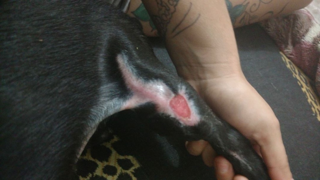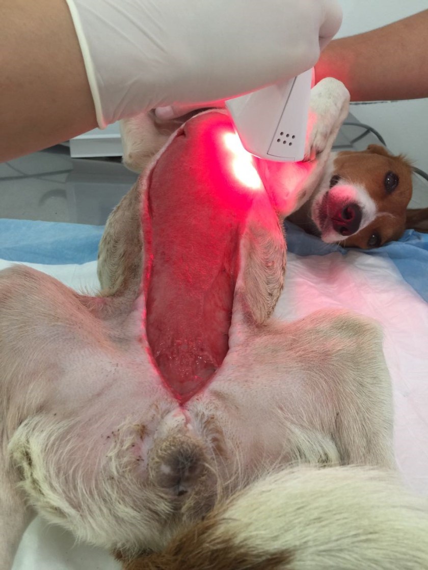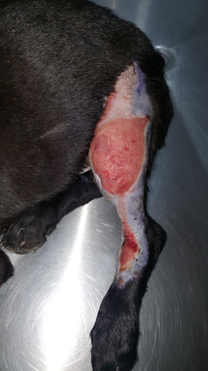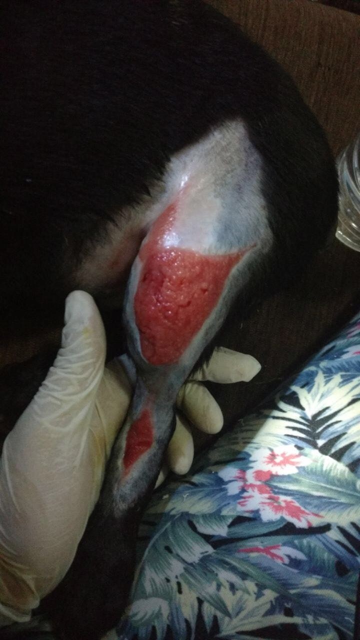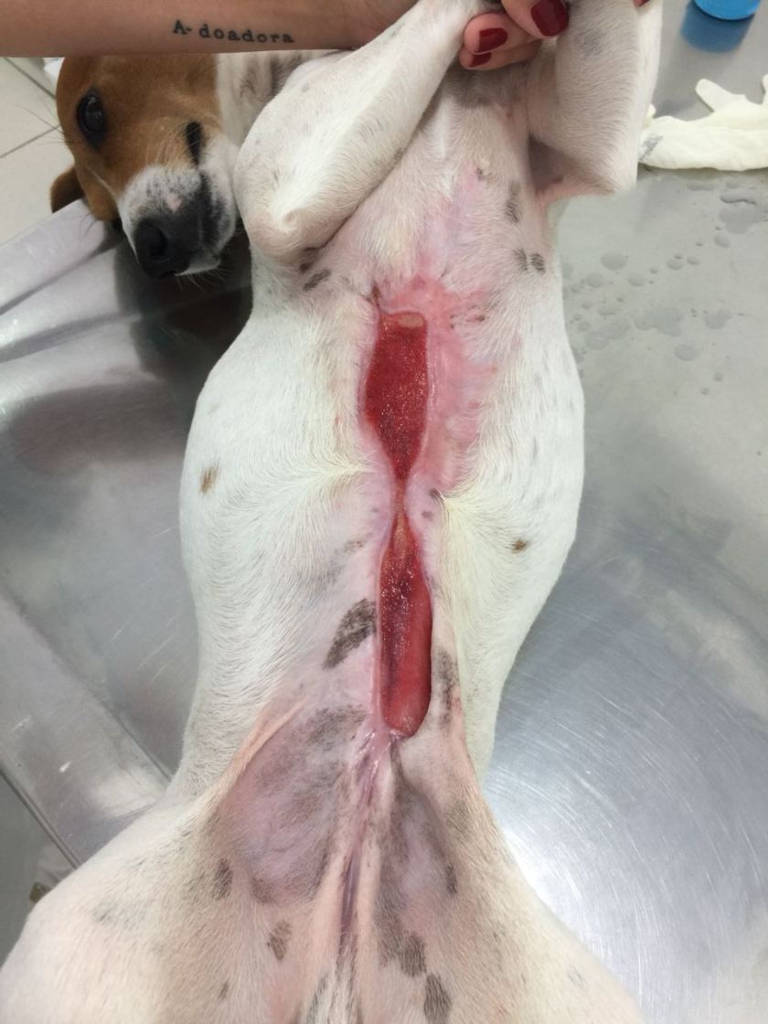 Parecer médico-veterinário: Foi observado uma rápida evolução inicial, o que chamou atenção, pelo fato da ferida reduzir 1cm ao dia. Após 3 meses de tratamento, optou-se pelo produto mais concentrado, para estimular a cicatrização total da ferida.