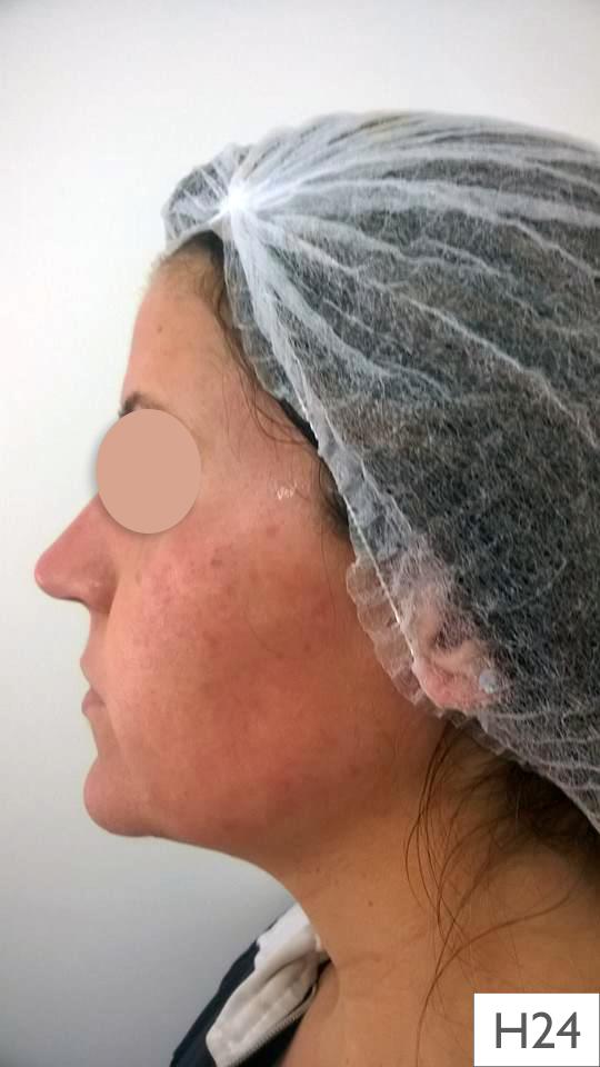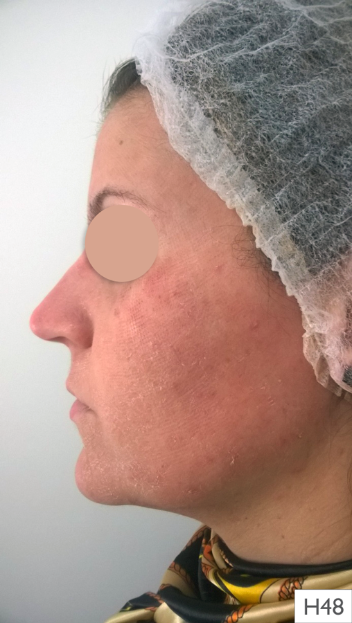 Parecer médico: Paciente jovem, com cicatrizes de acne, depois de ter realizado vários tratamentos com laser de CO2 fracionado, subcisão e preenchimento sem resultados satisfatórios, optamos por fazer o fenol atenuado oclusivo. Após a retirada do curativo com 48 horas, a pele estava com muita fibrina e avermelhada além de edema acentuado. Foi quando optei por utilizar EPIfactor® com soro fisiológico três vezes ao dia, com excelente recuperação em 10 dias.