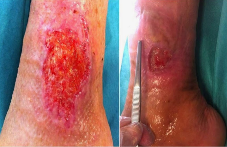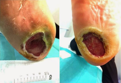 Etiologia da Lesão: Úlcera indolor, com sangramento na zona exterior do 5º dedo do pé esquerdo. Não apresenta melhoras apesar do tratamento tópico (povidona iodada + mupirocina em pomada) e antibióticos orais (levofloxacino + clindamicina).